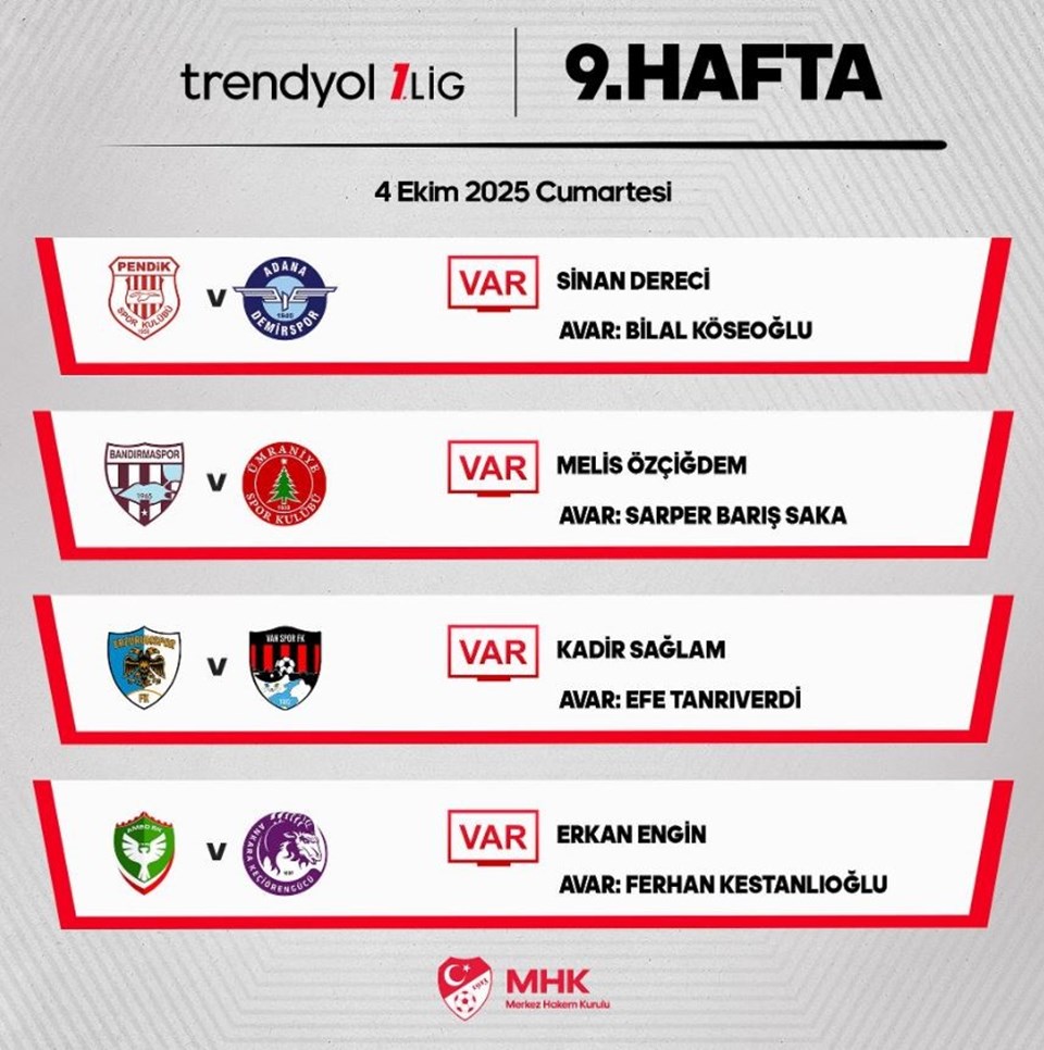 Merkez Hakem Kurulu, 4 Ekim Cumartesi günü oynanacak maçların VAR hakemlerini açıkladı.