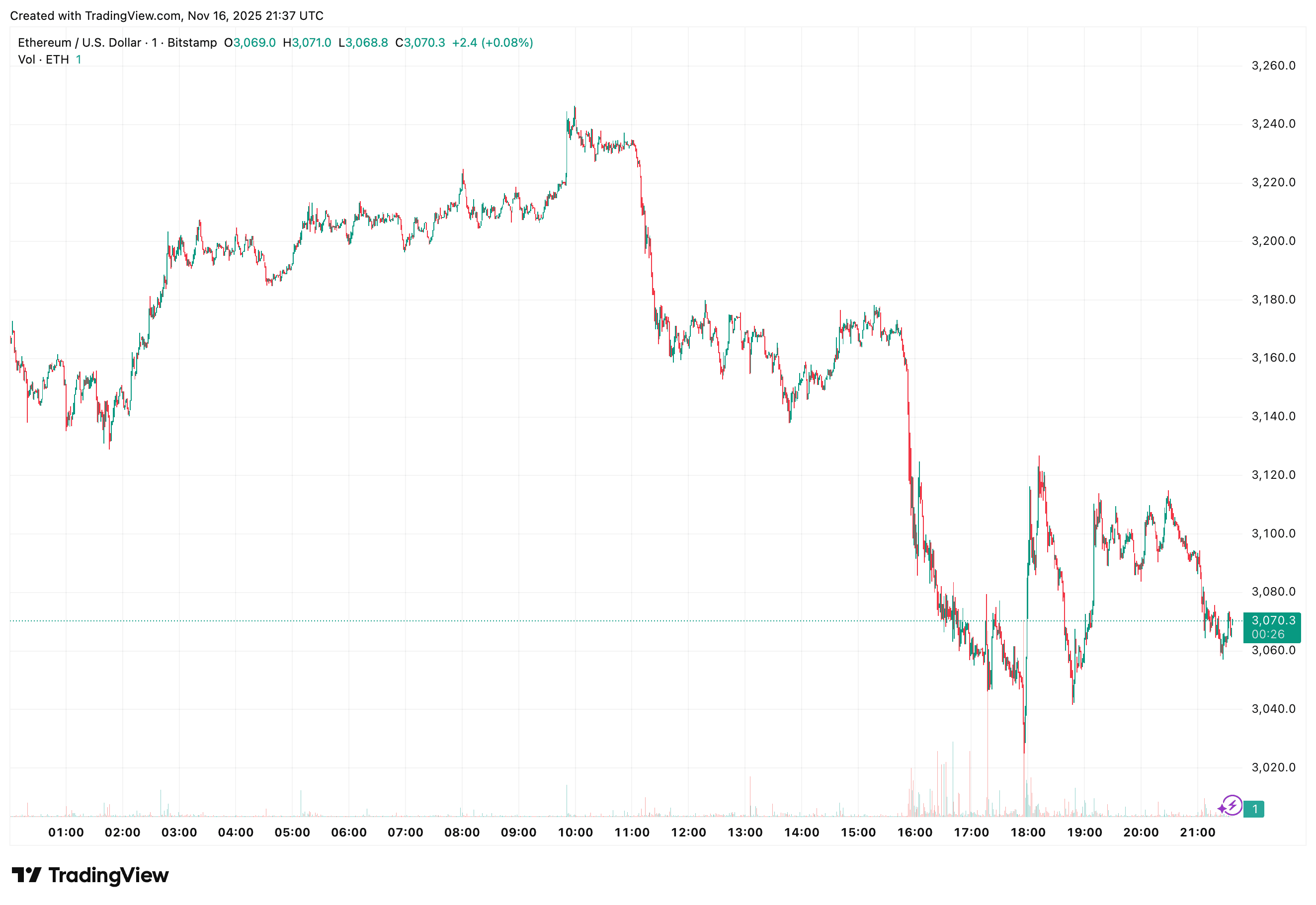 Ether ETH$3,068.73 traded below $3,100 on Sunday during a broader pullback in digital assets. The token was recently near $3,066 at 9:36 p.m. UTC, down 3.4% over the past 24 hours. It briefly fell through the $3,100 level on Bitstamp at about 4 p.m. UTC, marking its first break beneath that threshold since Nov. 4, based on data from TradingView.